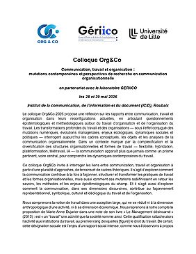 Cette année, Org&Co invite à examiner les liens entre communication, travail et organisation à travers leurs reconfigurations actuelles, en croisant les enjeux épistémologiques et méthodologiques liés au travail d’organisation et à l’organisation du travail.